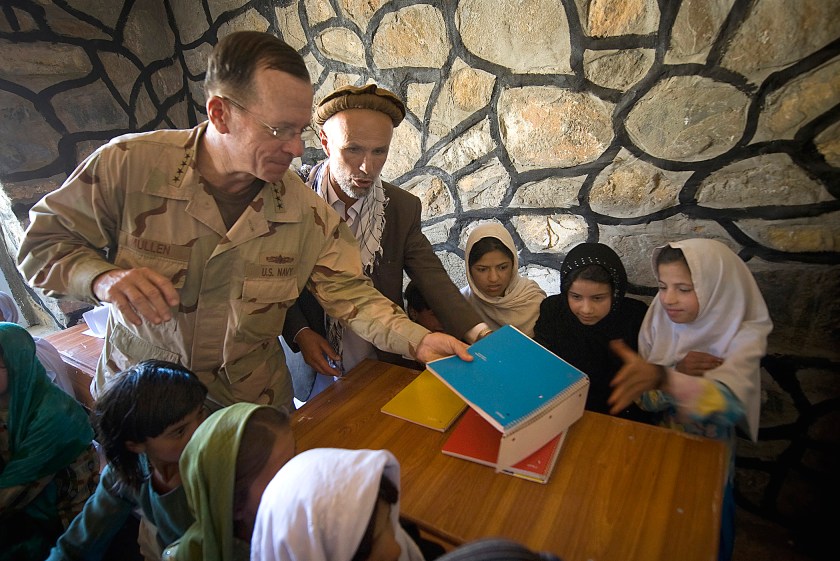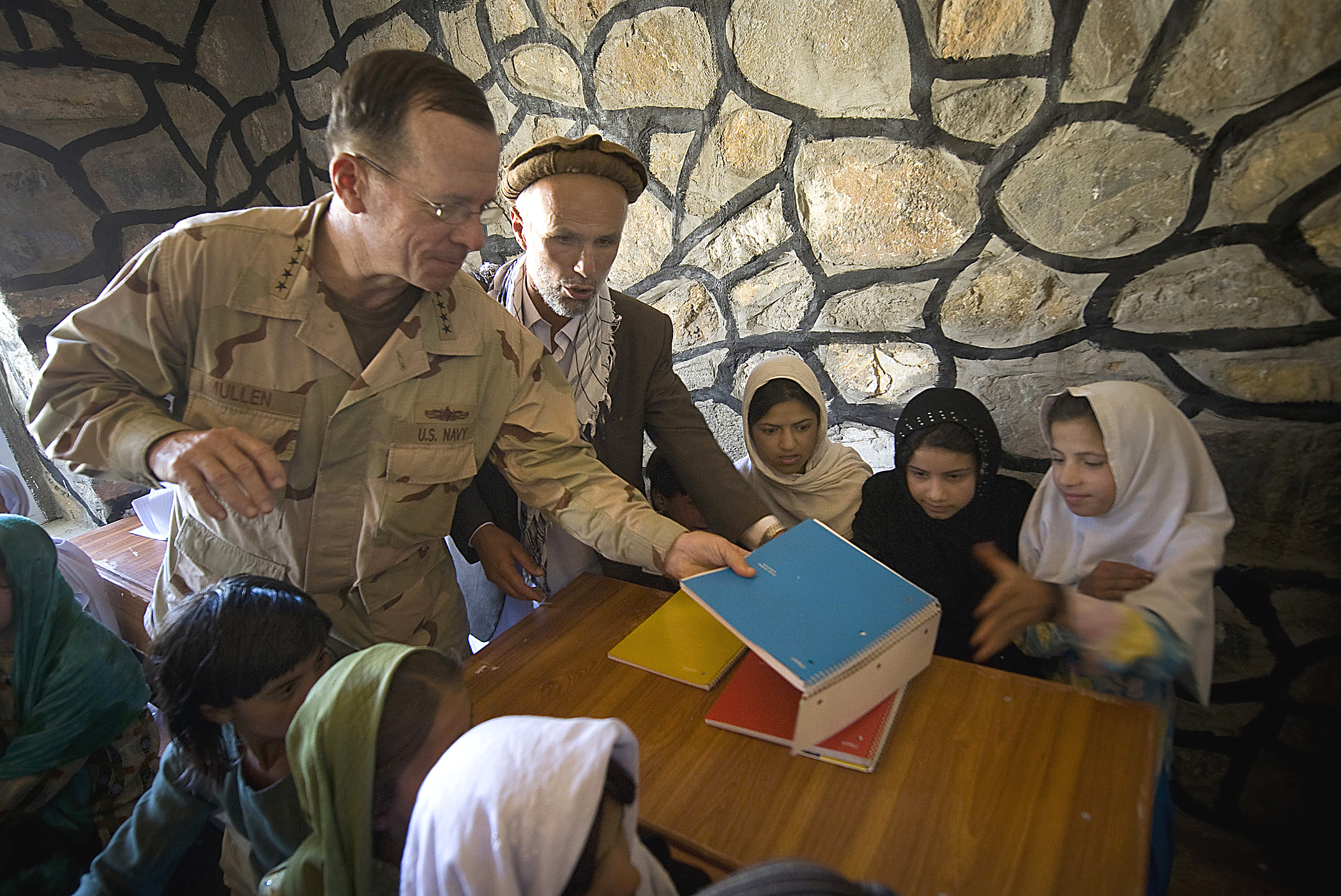 Navy Adm. Mike Mullen, chairman of the Joint Chiefs of Staff hands out notebooks at the opening of the Pushghar Village Girls School, Panjshir Valley, Afghanistan, July 15, 2009. The school located in a remote valley 60 miles north of the capitol Kabul was built by “Three Cups of Tea” author Greg Mortensen to promote and support community-based education, especially for girls, in remote regions of Pakistan and Afghanistan. (DoD photo by Mass Communication Specialist 1st Class Chad J. McNeeley/Released)