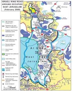 One particularly key project is the Eastern Ring Road, the idea of which is to ‘join the dots’ between Israeli colonies in East Jerusalem, and West Jerusalem. A proposed 11km section of the route goes through numerous Palestinian villages and neighbourhoods of Jerusalem, meaning the confiscation of over 1,000 dunams of land. According to a report in the Jerusalem Post in 2006, the idea of the ring road goes back some years, “and was first sketched onto maps by Ariel Sharon during his tenure as a Likud minister and planner of construction efforts designed to erase Israel’s Green Line boundary with the West Bank”.