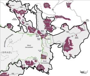 ‘Zoning’ land in East Jerusalem for particular purposes is an important way that Israel limits the natural growth of the Palestinian population. Some areas are declared ‘Green’, meaning no building is permitted there. In Jabal Mukaber, for example, 15,000 Palestinian residents are kept to 20% of the neighbourhood’s land, with the rest marked ‘Green’. However, there are a number of settlements that were built on land previously zoned as ‘Green’.