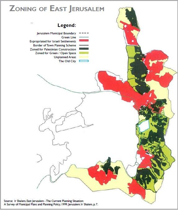 From 2000 to 2009, Israel confiscated PDF) over 40,000 dunams in Jerusalem; just under two-thirds of that total was taken in the last five years (’05-’09). In April last year, the UN OCHA reported (PDF) that only 13% of the Israeli-annexed area of East Jerusalem is ‘zoned’ for Palestinian construction (if permission is obtained).