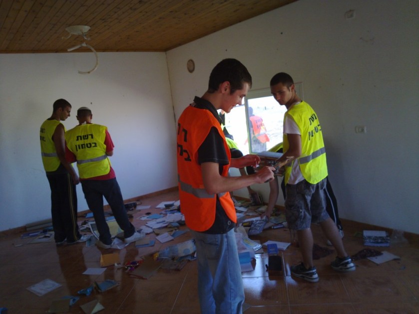 Arab Negev News publisher Ata Abu Madyam supplied me with a series of photos he took of the civilians in action. They depicted Israeli high school students who appeared to have volunteered as members of the Israeli police civilian guard (I am working on identifying some participants by name). Prior to the demolitions, the student volunteers were sent into the villagers’ homes to extract their furniture and belongings. A number of villagers including Abu Madyam told me the volunteers smashed windows and mirrors in their homes and defaced family photographs with crude drawings. Then they lounged around on the furniture of al-Arakib residents in plain site of the owners. Finally, according to Abu Matyam, the volunteers celebrated while bulldozers destroyed the homes.