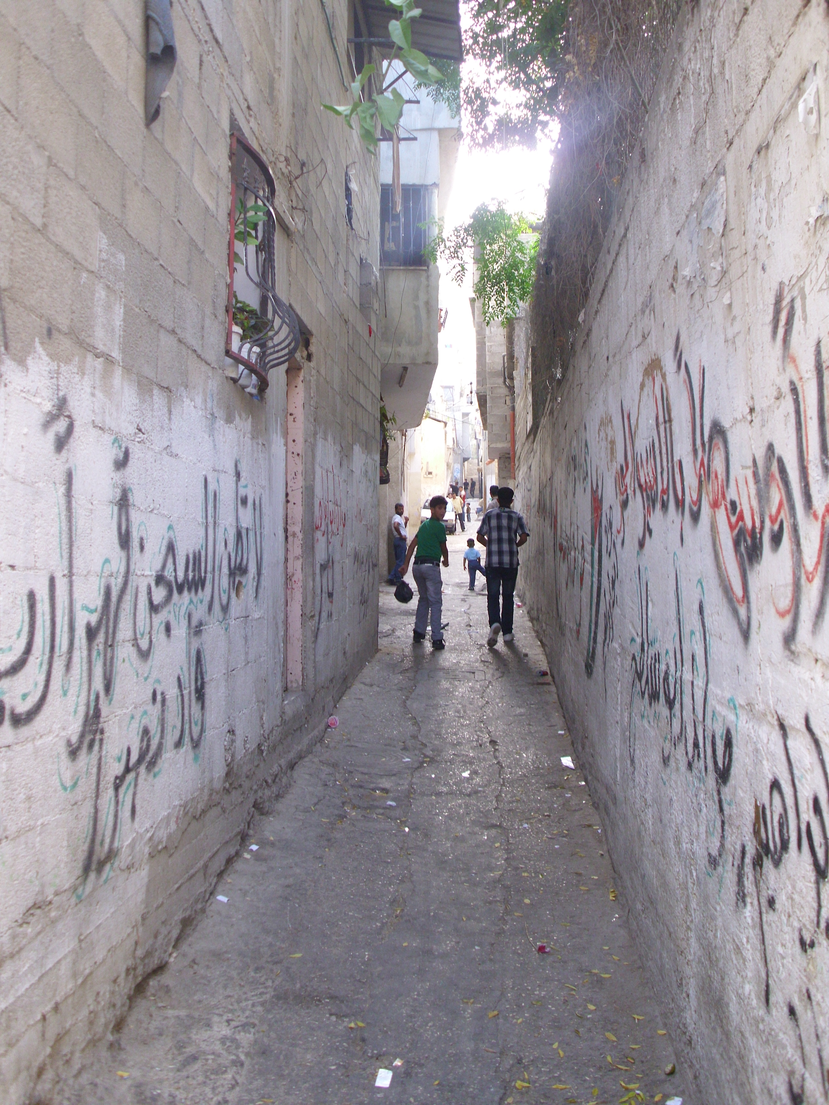 Balata Camp started as tents in the fifties, grew cement blocks in the sixties, installed sewage and water in the seventies, and has stretched ever upwards until now. The camp boasts the densest population in the West Bank: at least 25,000 people in a couple of square kilometres (the inhabitants claim up to 40,000). The buildings are so tightly packed that the kids forced out to play in the shadowed alleyways suffer from Vitamin D deficiency, sun deprivation. There are eight to ten people to a residential room. In school there are 50 children to a class. UNRWA schools and the graveyard take up most space. Most of the graves are those of people killed in the streets of the camp.
