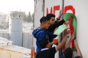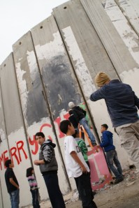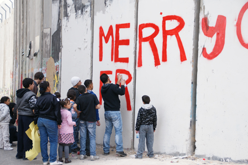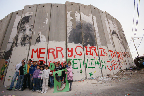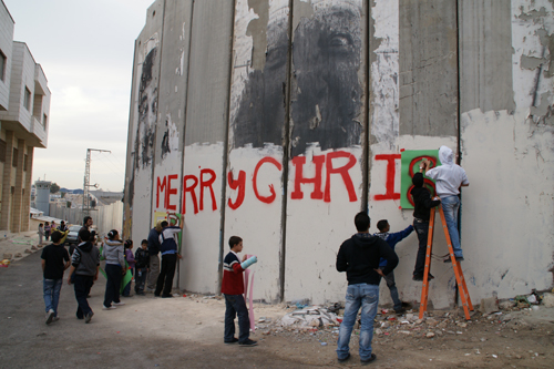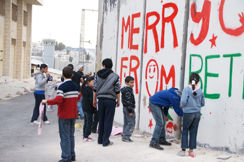 Images of the graffitied Christmas greeting and of the children creating the stencils and spray painting the message on the wall, as well as other projected images from Bethlehem, are available from William Parry. (Parry’s contact details follow the photographs)