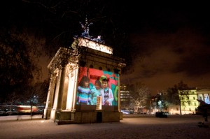 Image of Israeli separation wall in Bethlehem projected onto London monument