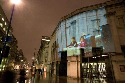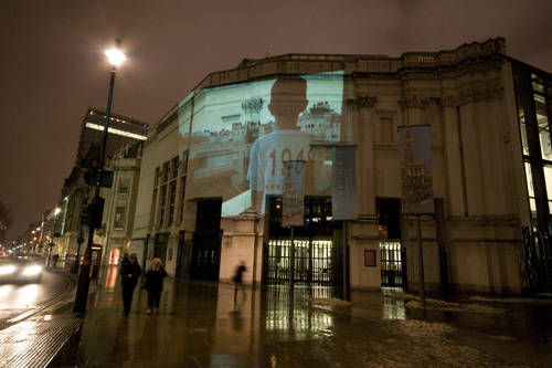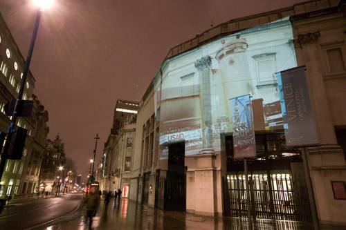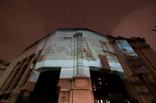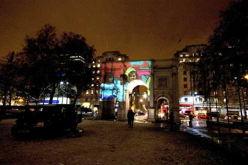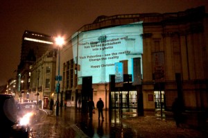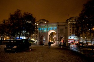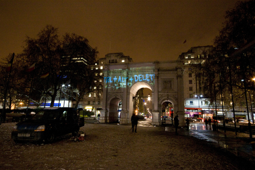 Over the fold are pictures from last night’s projections at Marble Arch, the National Portrait Gallery, and Parliament, where Parry reports his group was nearly arrested.