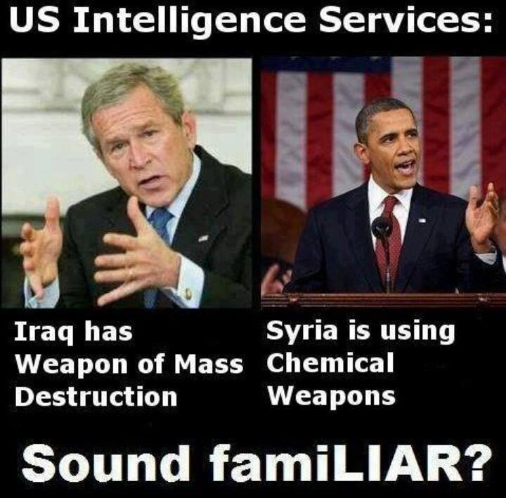 So much lazy thinking. Here’s an agit-prop picture doing the rounds, the sort to appeal to the George Galloway crowd. And here’s my comment: “Except it isn’t familiar. In one case they wanted to invade and used chemical weapons as an excuse. There were no chemical weapons. In the other case a genocide has been going on for over two years, they don’t want to invade, don’t even want to arm the people resisting, they don’t have the economic power or pliant international scene to do so even if they wanted; and chemical weapons not only exist, they have been used on a vast scale. Oppose potential US air attacks against Assad bases if you like, but don’t insult the victims of genocide while you’re doing it.”
