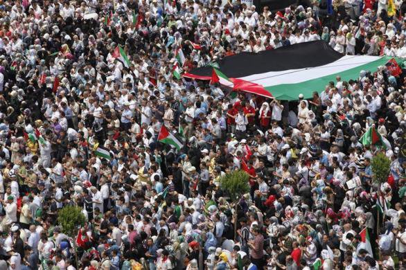 Previous Image Next Image 30670_111992678845939_100001056236233_80959_7058813_n Demonstrators hold a large Palestinian flag during a protest against Israel at Taksim square in Istanbul May 31, 2010.