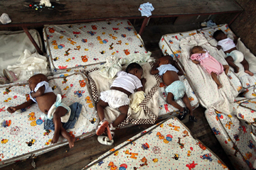 PORT-AU-PRINCE, HAITI – JANUARY 20: Orphaned children lay on mattresses inside a delivery truck at the Maison des Enfants De Dieu orphanage. (Photo by Joe Raedle/Getty Images)