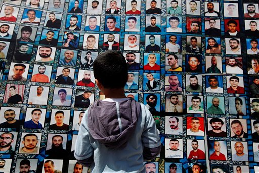 A Palestinian child looks a a banner made up of photographs of Palestinian prisoners being held in Israeli jails. (AP Photo/Tara Todras-Whitehill)