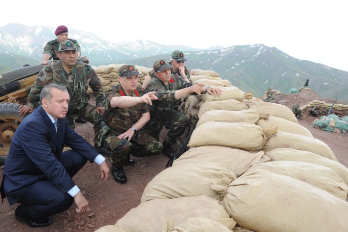 BASBAKAN RECEP TAYYIP ERDOGAN VE GENELKURMAY BASKANI ORGENERAL ILKER BASBUG, TERORISTLERLE ILK SICAK TEMASIN YASANDIGI, SIZMALARIN GERCEKLESTIGI GEDIKTEPE BOLGESINDEKI MEVZILERI ZIYARET ETTI. (ANADOLU AJANSI – KAYHAN OZER) (20100620)