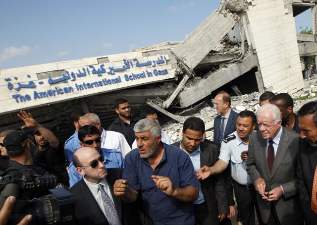 Previous Image Next Image carter President Jimmy Carter with the media at the ruins of the American International School, which was destroyed during Israel’s offensive in Gaza earlier this year. Photo: AP