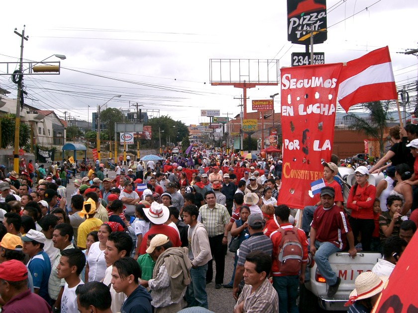 Outside Toncontin airport, a poster reaffirms commitment to the battle for a National Constituent Assembly to reform the current constitution, which hails from the era in which Honduras served as a base for the U.S. contra war against Nicaragua. (Photo: Belén Fernández)