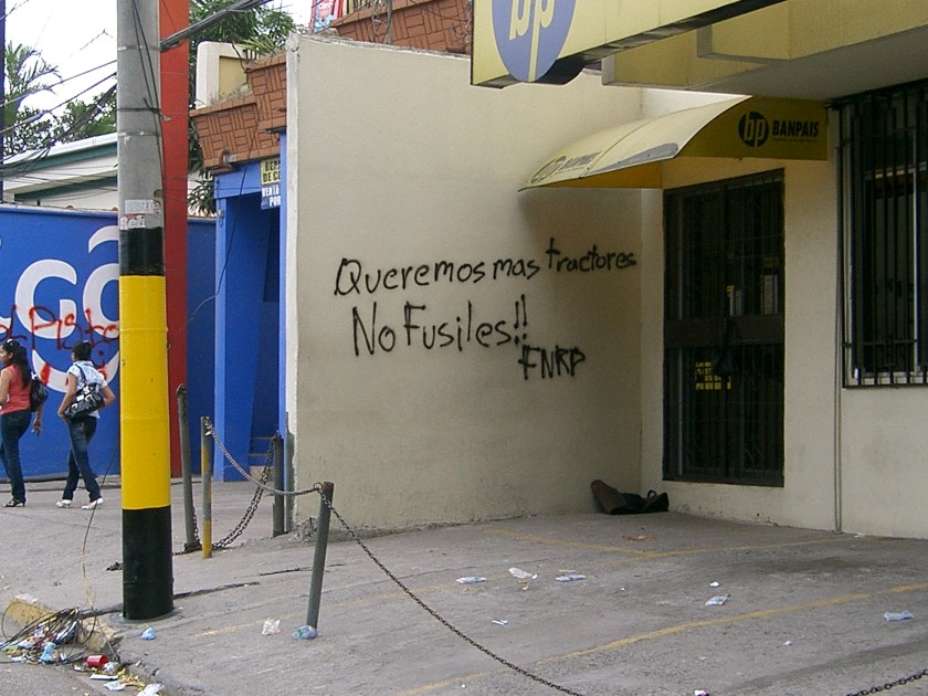 Graffiti signed FNRP (the anti-coup National Front of Popular Resistance) proclaims: “We want more tractors, not guns”, possibly in reference to Hugo Chávez’ tendency to donate tractors to allied governments. Gun donations meanwhile tend historically to come from further north. (Photo: Belén Fernández)