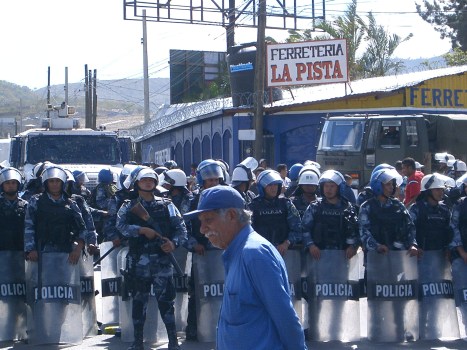Previous Image Next Image CIMG2996 Police stand by in case more anti-coup schoolteachers require fatal bullets to the head. (Photo: Belén Fernández)