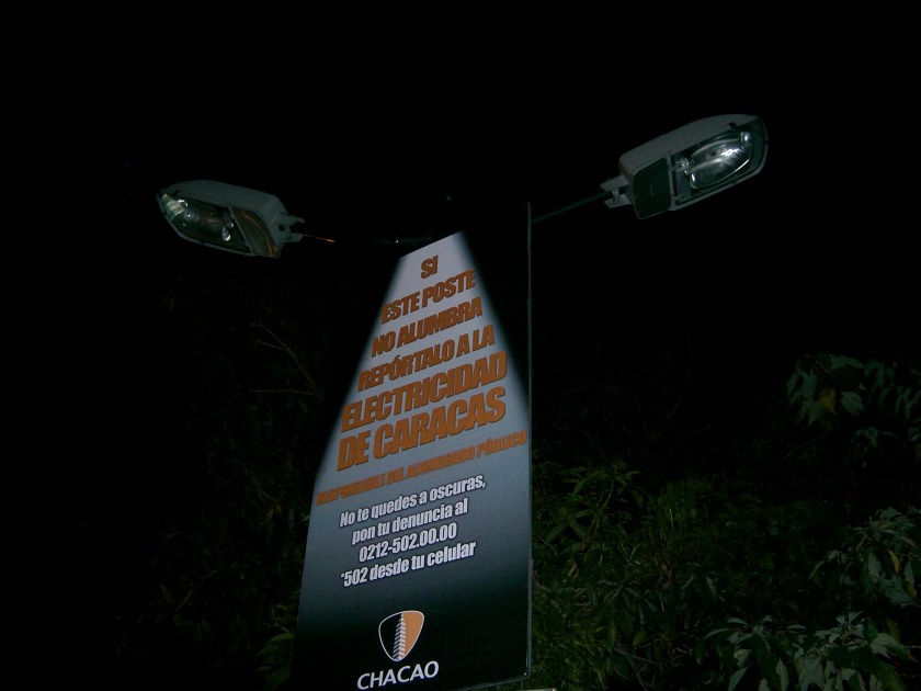 Previous Image Next Image CIMG3057 Caracas streetlamp inviting citizens to report malfunctions may soon invite them to purchase a flashlight, instead. (Photo by Belén Fernández)
