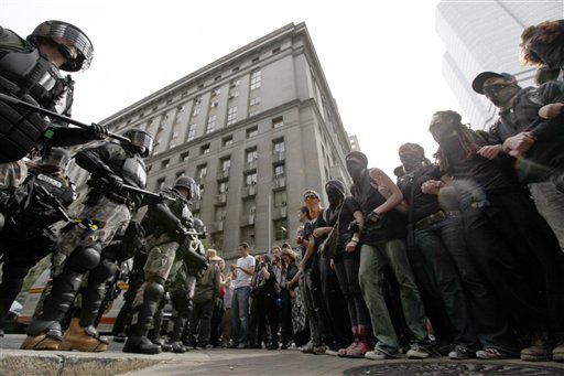 Protesters face riot police downtown Pittsburgh on September 25, 2009. Thousands of protesters marched through the streets during the Group of 20 summit of world leaders. (AP Photo/Matt Rourke)