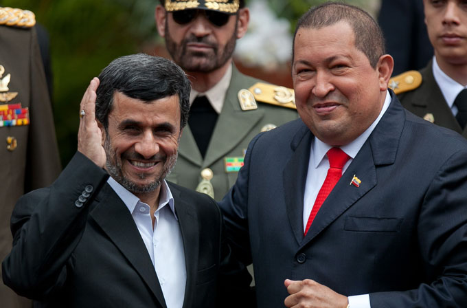 epa03054794 Venezuelan President, Hugo Chavez (R), receives Iran’s counterpart, Mahmoud Ahmadinejad (L), at Miraflores Palace, Caracas, Venezuela, 09 January 2012. Chavez said that both leaders have played the role of ‘stopping the imperialist madness’ of United States Government and hopes to continue bilateral cooperation. EPA/BORIS VERGARA