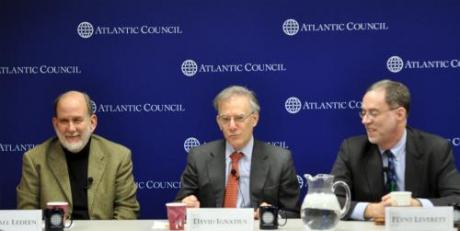 Previous Image Next Image ledeen-leverett Michael Ledeen, host David Ignatius and Flynt Leverett at a debate hosted by the Atlantic Council.