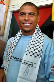 Brazilian soccer star Ronaldo wears a traditional Palestinain scarf, with the word “Palestine” written on it in Arabic, as he visits a center for disadvantaged youths funded by the UN in the West Bank town of Ramallah, Monday, May 16, 2005.