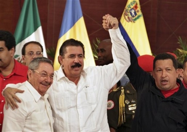 Venezuela’s President Hugo Chavez, right, rises the arm of ousted Honduras’ President Manuel Zelaya, center, who embraces Cuba’s President Raul Castro at the end of the Central American Integration System, or SICA, summit in Managua, Monday, June 29, 2009. (AP Photo/Miguel Alvarez)