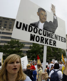 Previous Image Next Image obama_undocumented_worker Demonstrators hold up banners during a taxpayer rally at Freedom Plaza in Washington, Sept. 12, 2009. (AP Images)