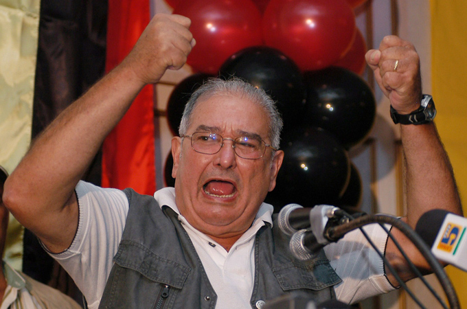 epa00184045 Guillermo Endara, former Panamanian president and presidential candidate for opposition Solidarity Party (PS), gestures during a press conference after learning the preliminary results of Panama’s presidential elections, Sunday 02 May 2004, in Panama City. With 198.089 votes Endara has obtained the second place, whereas Martin Torrijos, presidential candidate for “New Homeland” Alliance and opposition leader of Democratic Revolutionary Party (PRD), is the winning candidate with 309.767 votes. EPA/Jorge Nuñez