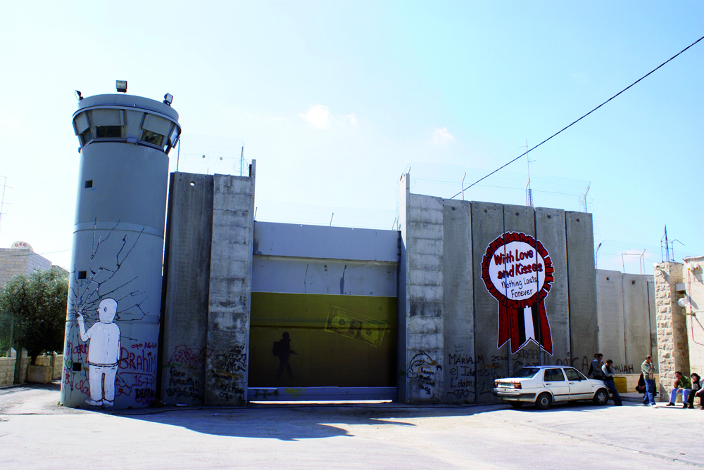 Beyond this gate lies Rachel’s Tomb. The area, with shops and several beautiful traditional homes with gardens of fragrant jasmine and olive trees, is now a wasteland, the buildings and businesses largely abandoned – over 90 per cent of the shops and commercial establishments in this area have closed or relocated, UN oCHA reports. Artwork by Blu (detail and drawing), Who’s paying for this? by Peter Kennard and Cat Picton Phillips, and With love and kisses by the New York collective, faile. (Drawing reproduced with the permissionw of Blu.)