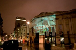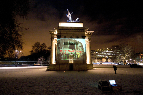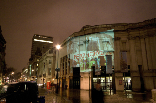 Below are some final shots from William Parry, UK-based photojournalist who, with the help of projection artist Beverley Carpenter, has spent the last several days projecting images of Israel’s apartheid wall onto buildings and monuments in London. The projected images were taken by Parry in Bethlehem, where children from the Aida refugee camp stenciled a Christmas message to the world onto their section of the wall. The goal of the project: to raise awareness of the Israeli-induced suffering that continues in Bethlehem, exploiting the city’s relevance to the current holiday, and in Palestine as a whole. (For more background and the first two sets of Parry’s photographs from Bethlehem and London, click here and here.)