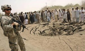 A US soldier keeps watch at the site of an explosion in Logar Province south of Kabul Photograph: Omar Sobhani/Reuters