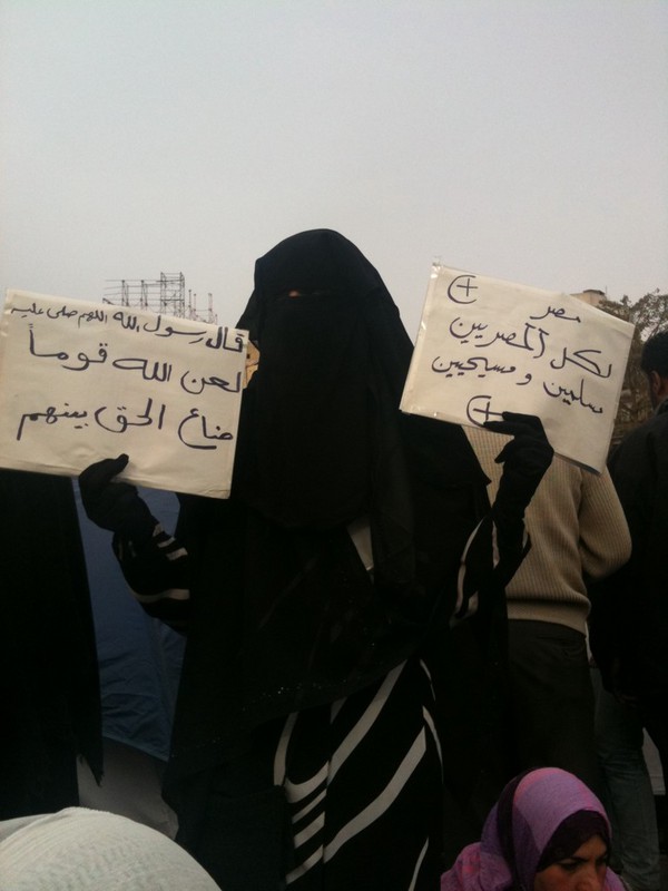 Previous Image Next Image Photograph Tweeted by “Egyptocracy” of a Niqab-clad Egyptian woman holding a sign: “Egypt is for Everyone – Muslims and Christians” Photograph Tweeted by “Egyptocracy” of a Niqab-clad Egyptian woman holding a sign: “Egypt is for Everyone – Muslims and Christians”